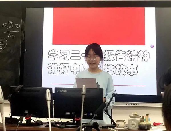 简文君和崔晓婕两位支部同志以英语演讲的形式向大家分享了自己眼中的中国科技。简文君同志从宏观角度出发,带领大家回顾了中国所取得的技术方面的成就,如原子弹、东方红一号、杂交水稻等发明,并表示科技进步促进了国家的强盛,而作为青年人的我们,应当在推动建成“科技强国”的过程中发挥出自己的作用。崔晓婕同志则从微观的日常生活角度切入,向大家分享了如高铁、共享单车、移动支付等技术给人们带来的便利,表示中国所取得的巨大科技成果与人们的生活息息相关。