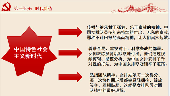 接下来苏俊玲概括了女排精神的具体内涵,并系统梳理了中国女排精神诞生的时间轴,回顾了女排精神诞生的时期的国内外环境等因素,详细介绍了在改革开放和社会主义现代化建设新时期以及中国特色社会主义新时代不同的历史时期中女排精神的时代意义,让党员同志们充分体会到了中国女排精神的现实意义和带给我们的人生启迪。正如习总书记2019年会见女排队员和教练员代表时所说的,广大人民群众对中国女排的喜爱,不仅是因为她们夺得冠军,更重要的是她们在赛场上展现了祖国至上、团结协作、顽强拼搏、永不言败的精神面貌。女排精神代表着一个时代的精神,喊出了为中华崛起而拼搏的时代最强音,而这种精神至今仍在激励着我们每一个当代中国人。