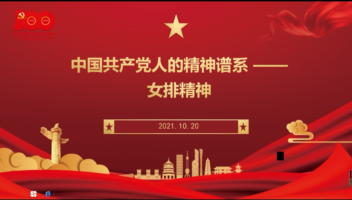苏俊玲书记首先介绍了本次微党课的背景,百年来中国共产党从伟大建党精神这一源头出发,形成了包括井冈山精神、长征精神、延安精神、西柏坡精神、“两弹一星”精神、雷锋精神、红旗渠精神、特区精神、脱贫攻坚精神、探月精神等等在内的一系列伟大精神,我们党之所以历经百年而风华正茂、饱经磨难而生生不息,就是凭着那么一股革命加拼命的强大精神,读懂中国共产党,就必须读懂中国共产党的精神,而此次所讲的女排精神就是其中之一。