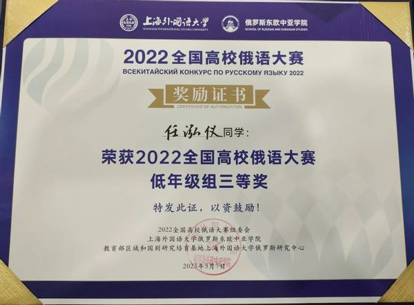 2023年5月5日-7日,2022全国高校俄语大赛复赛和决赛环节在上海外国语大学松江校区举行。经过两天的激烈角逐,我院俄语系参赛选手、2021级本科生任泓仪同学,在班婕老师的指导下,以低年级组总成绩第13名的好成绩,荣获2022全国高校俄语大赛三等奖。