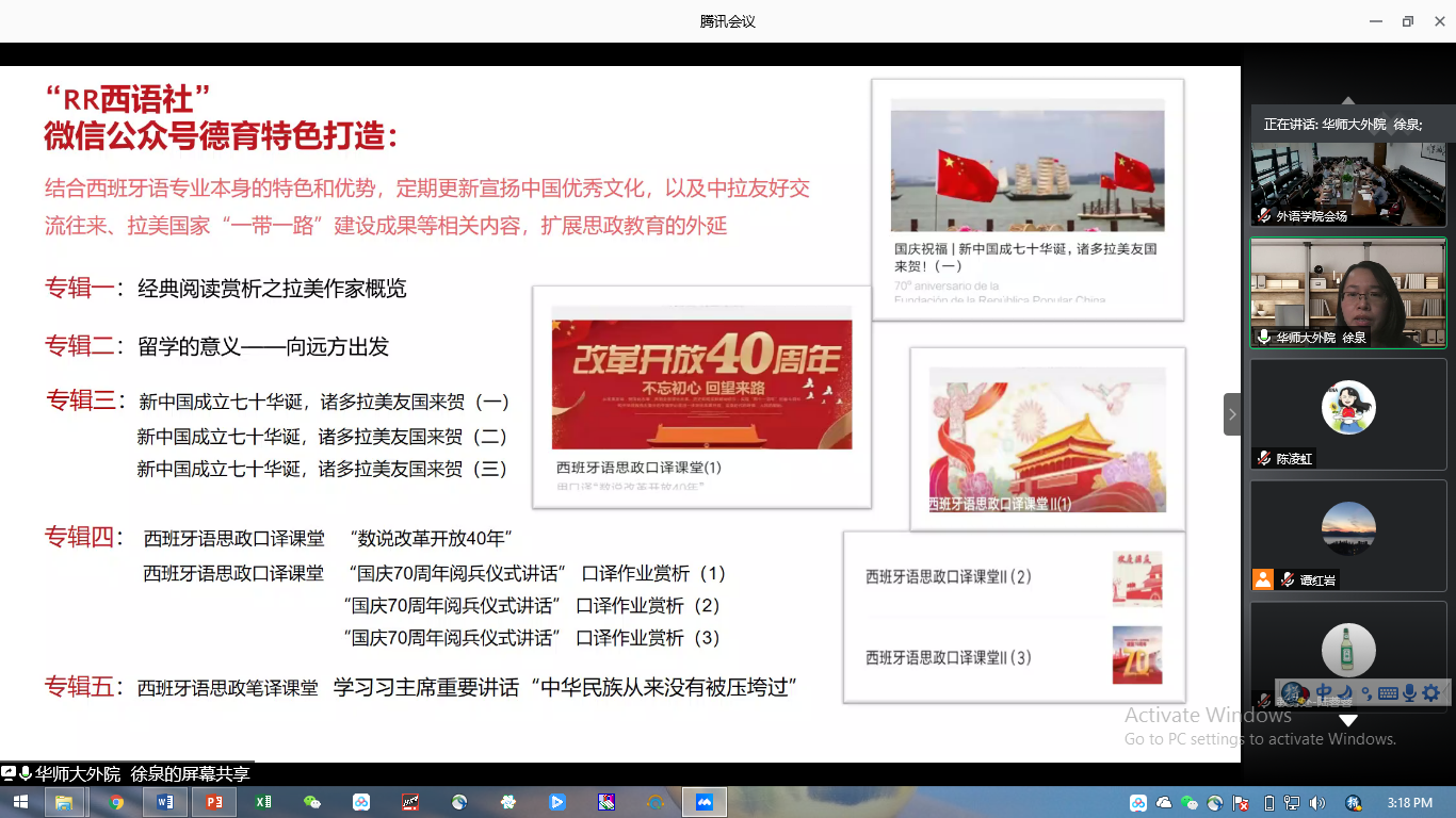 支部党员徐泉在交流会上做了“西班牙语课程思政特色专业建设心得——以学习《习近平谈治国理政》为例”的报告,以拉美国家社会文化、西班牙语口译、西班牙语精读等课程为例,介绍如何将思政内容融入西班牙语的专业课程中。报告资料翔实,深入具体,为我们展现了优秀的课程思政设计案例。