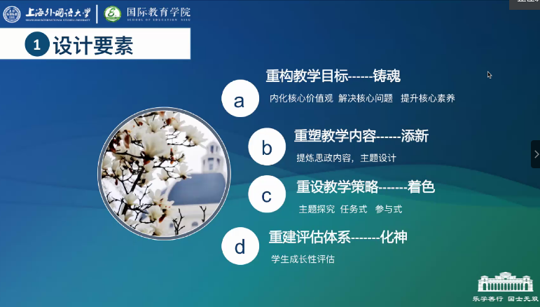 支部书记陈凌虹参与了话题讨论,先简单介绍日语系思政示范专业建设情况和自身特色,即思政课程涵盖面广,综合性高。既有古典也有当代、即包含专业课程也包含全校性通识课程、既有理论型课程也有实践型课程,且全部课程获得华师大思政课程设计比赛奖项。同时,课程思政和党建紧密结合、课程思政与三全育人融合统一,课堂内融入思政内容,课堂外引导学生参与科研创新,增强学生对中外语言文化的理解、主动传播好中国声音。其次指出了今后努力的方向:不同的课程,与思政内容,有强关联和弱关联的区别,如何找到思政内容和专业知识的契合点,做到无缝对接和有机融合,关键在于提高教师课程设计能力,需要多学习、多思考、多交流;继续加强自身的的人文素养和思政素养,结合党建,让非党员教师也参与到党支部的活动中来,使理论与实践相结合;重设课程评估体系,确认思政课程设计和实施的成效。