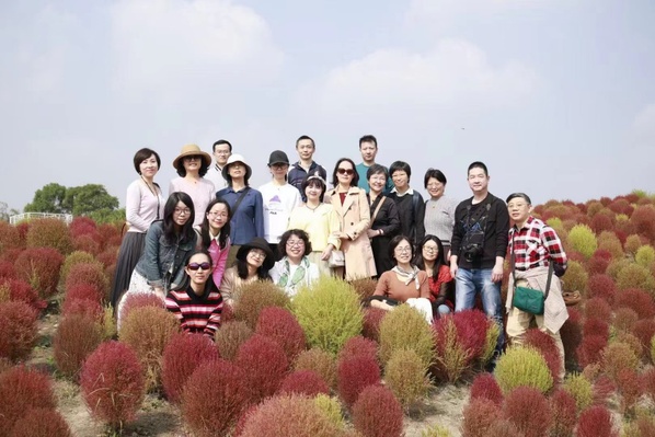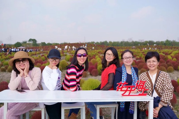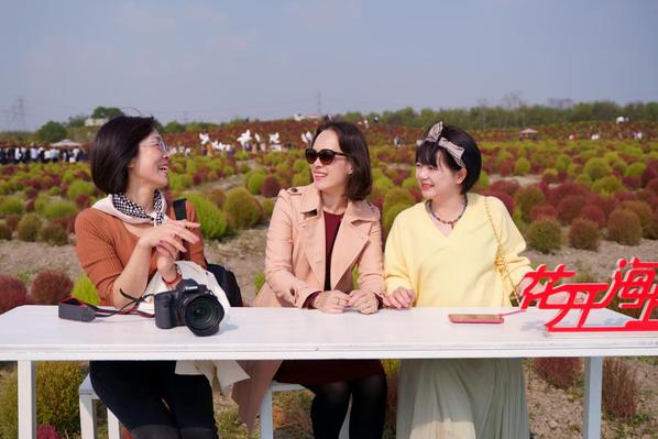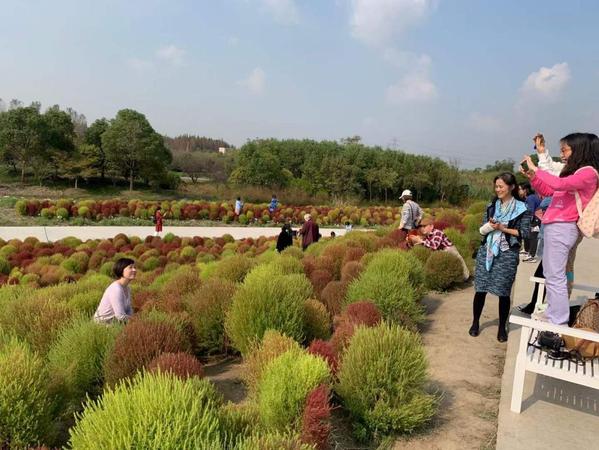 秋景园的主角是大约20万株地肤。地肤是藜科地肤属植物,又名扫帚草、孔雀草,是一年生草本。株形矮小,叶细软,嫩绿色,秋季转为红紫色,是花开海上标志性的景观。历经夏日酷暑、初秋清凉之后,地肤开始展现出她最美的姿色。红、紫、褐、粉、黄、绿,色彩斑斓。