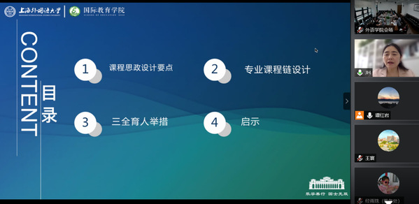 上海外国语大学教务处副处长王会花则介绍了他们作为上海市率先试点课程思政的高校,学校结合外语特色开展的系列课程思政教学改革,尤其是“课程链”的设计与做法。