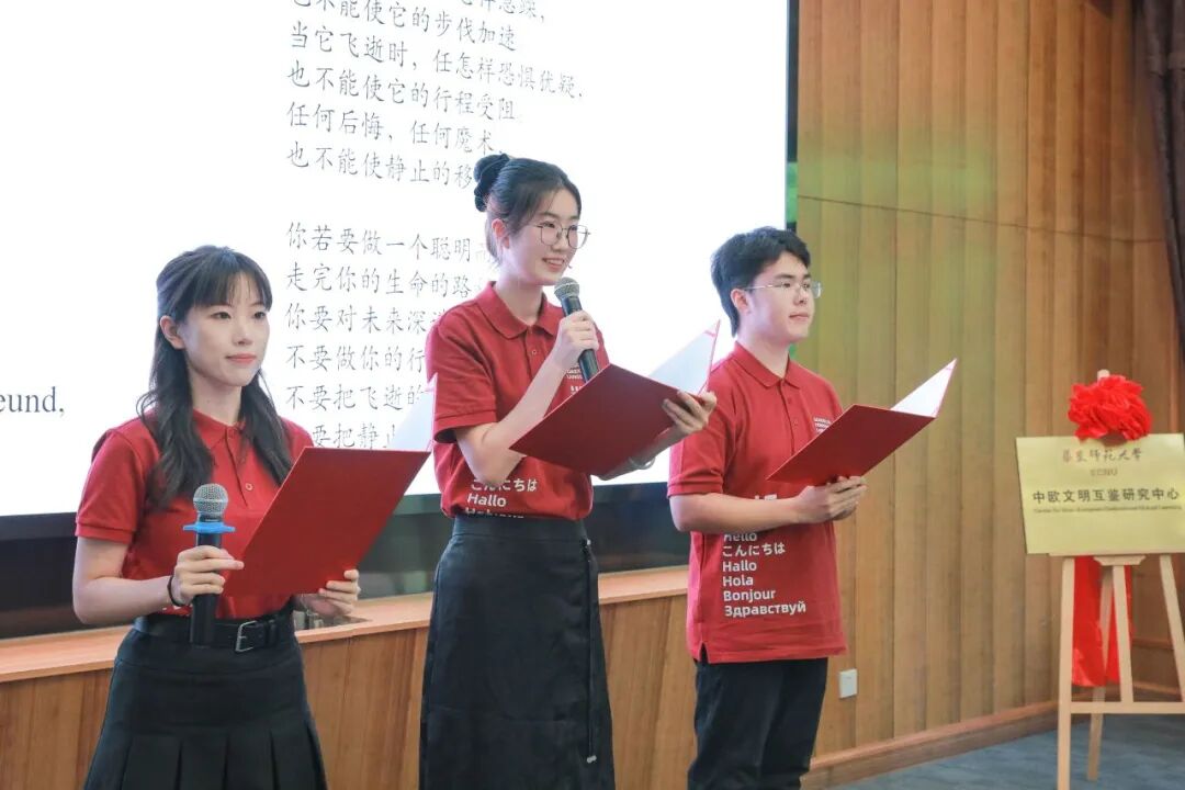 德语系研究生李子涵、张邵楠、胡若宇朗诵德国著名文学家席勒的诗作《孔夫子的箴言》