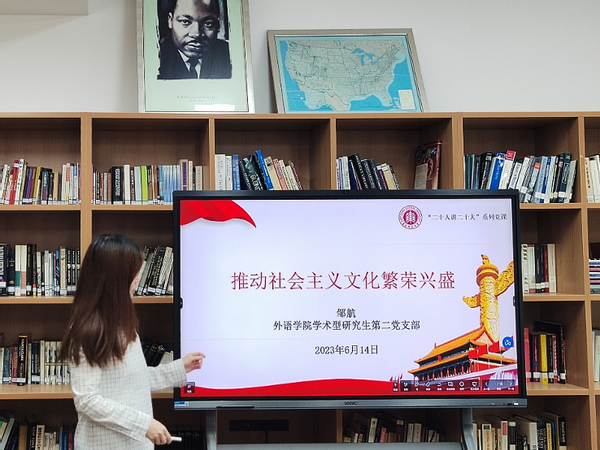为加强支部党员的思想和理论武装,提高党性修养和政治觉悟,增强思想认同和文化使命感,2023年6月14日下午,必赢线路检测3003no1学术型研究生第二党支部于外语楼216室开展“二十人讲二十大”支部书记讲党课主题党日活动。本次党课由必赢线路检测3003no1学术型研究生第二党支部书记邹航主讲,主题为“推动社会主义文化繁荣兴盛”。支部党员参加会议。