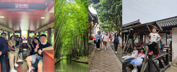 穿过早园竹林,我们来到了银杏渡口,乘船游览水上森林。河道宽约2丈,两岸幽静的竹林葱葱郁郁,繁盛交错,风从竹林间吹过透着丝丝凉意,潺潺的流水声让我们仿佛置身世外桃源一般。船行过半,穿过一座爬满青苔的石拱桥。孩子们渐渐胆大了起来,在船尾探头观望,